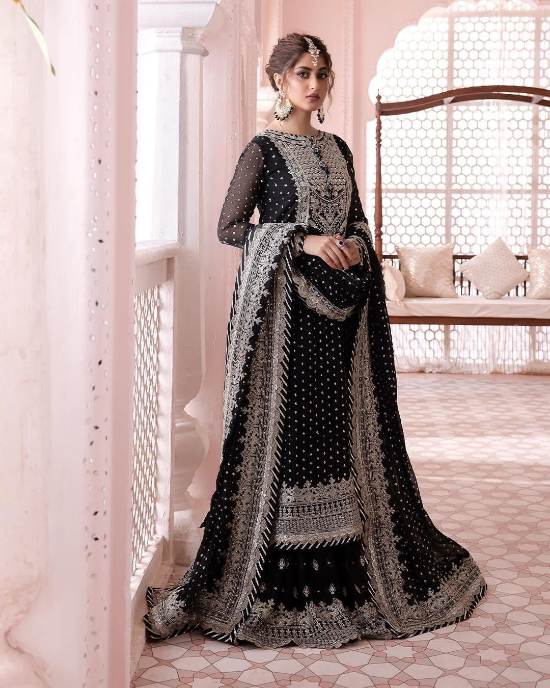 Discover the secrets of the “Chandni Collection”, as Sajal Aly showcases the sleek straight shirt and heavily embroidered lehenga outfit. This design is embellished with silver zari and cupped sequins, creating a poetic simile of a starlit noir sky. The neckline is embroidered with intricate detail, giving it a traditional touch. The lehenga has gorgeous borders running along hem paying homage to our cultural heritage. It features a lushly endowed dupatta framed by embroidered borders which enhances this royal look.