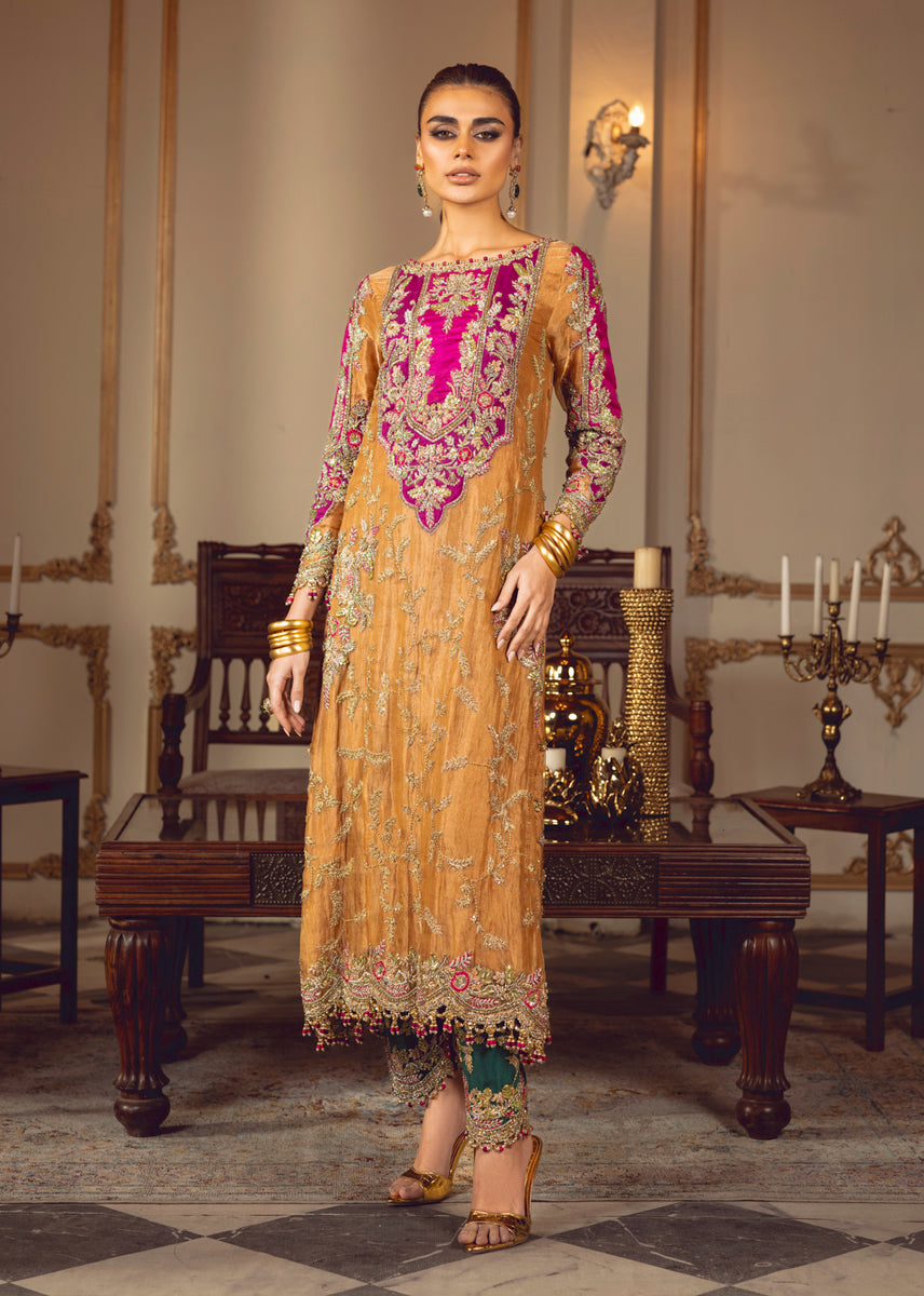 In the dimly lit room, SULTANIQUE emerges like a spectral bloom created with pure tissue in pale tangerine tone adorned with ethereal floral motifs paying homage to tales of ancient traditions. The ensemble celebrates old school elegance with each taanka laden carefully on the eclectic appliques creating a myriad of colors amalgamating convention with modernity. The turquoise green raw silk pants break the monotone of color and fabric exuding festivity and a mood of color and happiness.