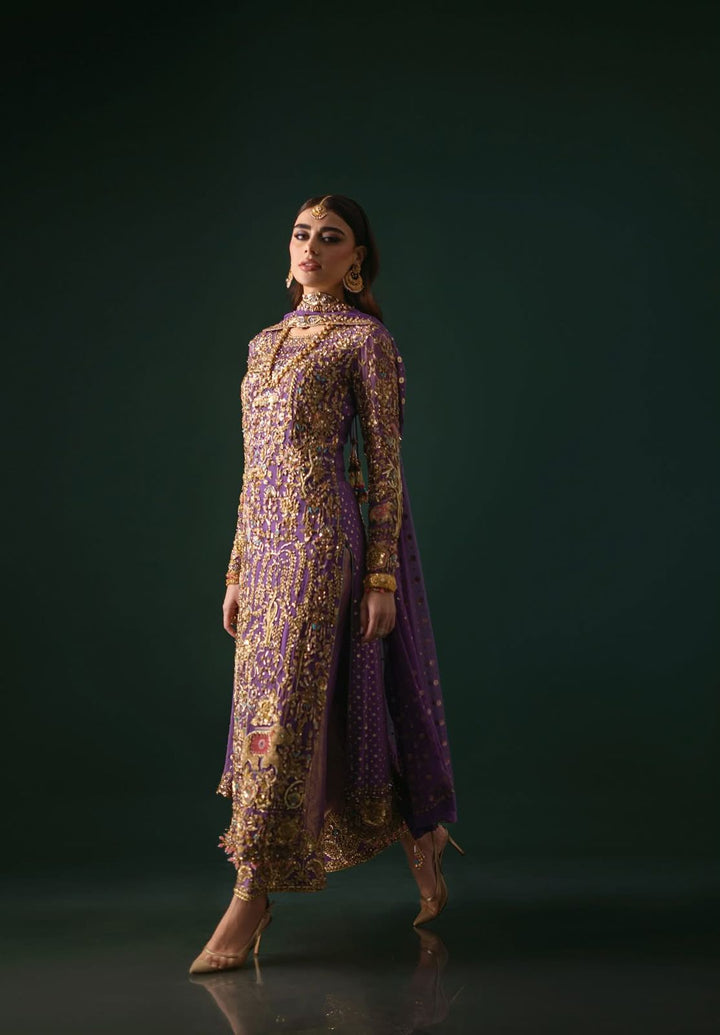 Draped in rich purple hues and adorned with heavy, intricate embellishments, this Nomi Ansari masterpiece is a symphony of floral and animal patterns. The bejeweled details, bordered ezaar work, and long, flowing dupatta with cutwork create a regal design that radiates tradition and luxury.
