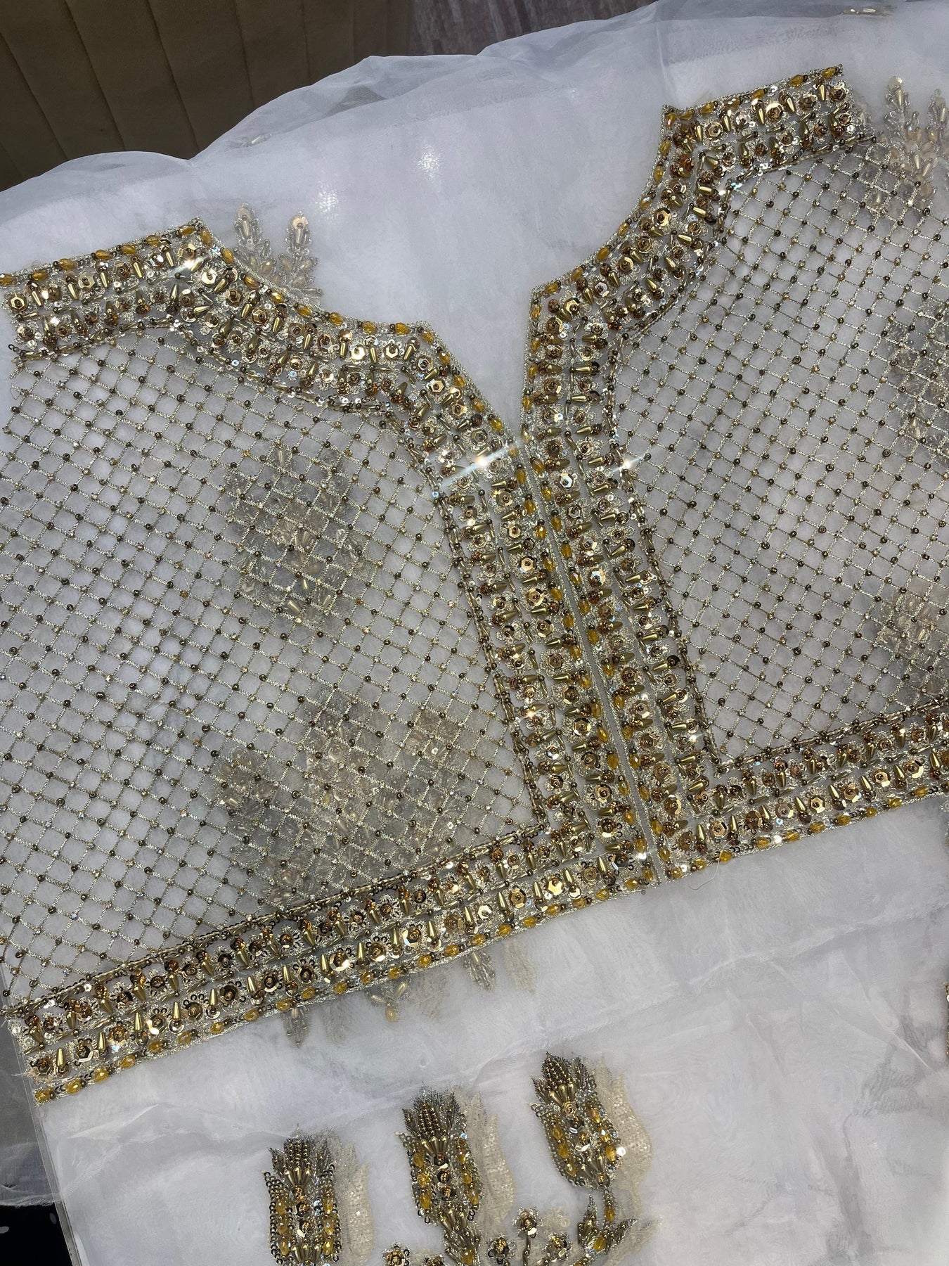 A classic Ivory organza peshwas crafted with exceptionally intricate embellishment of handwork on body, sleeves and in panels, pairing with rich satin silk lehnga with chanderi silk border finishing. To complete the grandeur look it comes with organza duppata with heavily embellished borders on four sides and with net duppata finishes with gotta and Kiran on four sides.