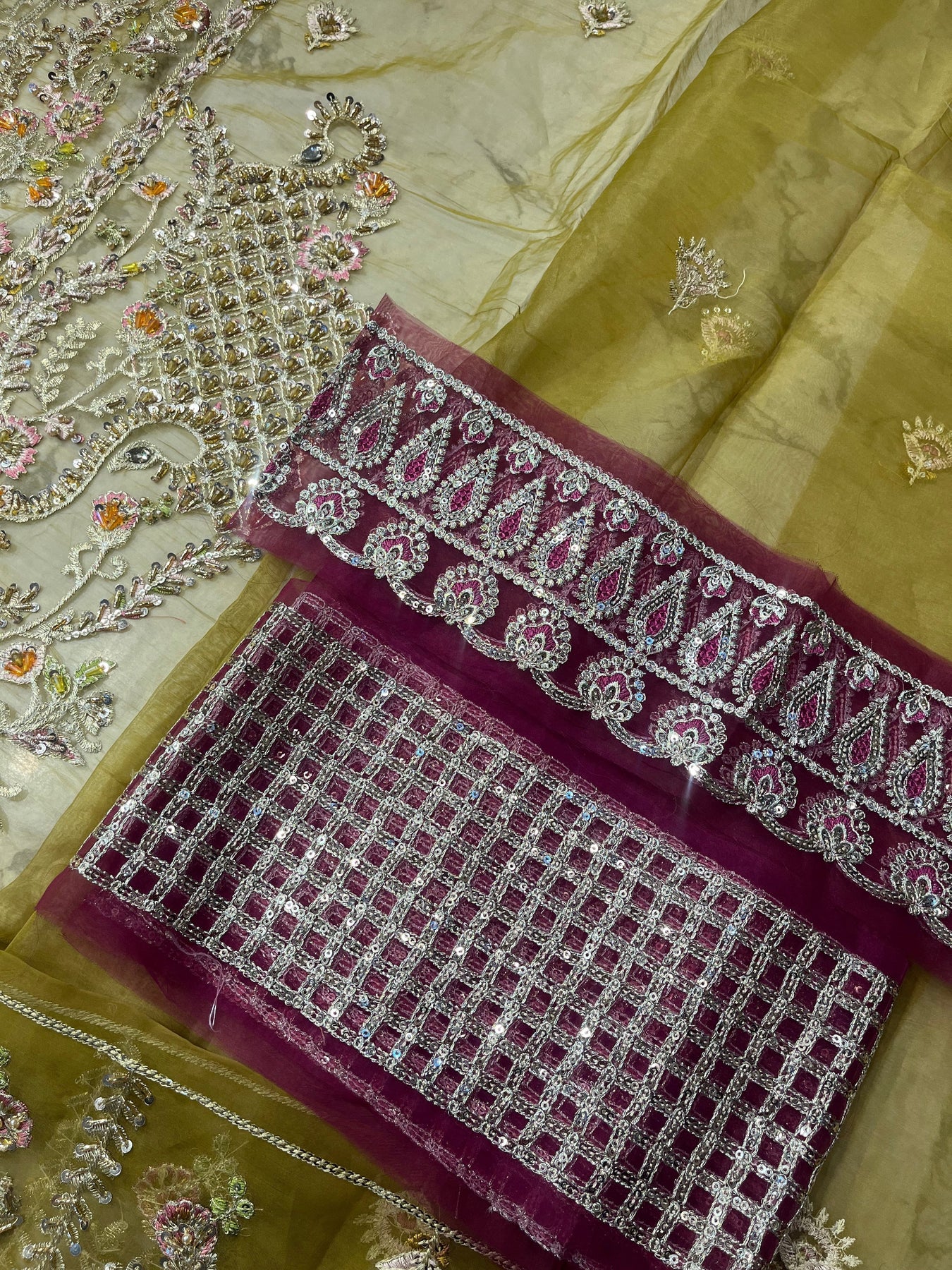 The olive green shirt exudes regal allure, its intricate embroidery and shimmering embellishments catching the light with every step you take. Delicate motifs and intricate designs adorn the fabric, creating a mesmerizing tapestry of beauty that commands attention and admiration. The stunning masterpiece, has embroidery and embellishments that glisten with every step. This traditional outfit is paired with detailed laser work and embroidered spray dupatta completing the stunning outfit. Step into the spotlight and leave a trail of awestruck admirers as your flaunt this outfit. Enhancing the ensemble's allure is the four-side laser border dupatta, a true work of art that completes the look with its intricate detailing and mesmerizing beauty. The laser-cut patterns add depth and dimension to the dupatta, creating a captivating visual impact, while the rich olive green hue complements the embroidered shirt perfectly. the crushed pants, offering both comfort and style, while the relaxed fit ensures ease of movement.